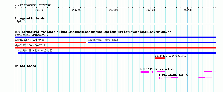 Variant DetailsVariant: dgv3122n100| Internal ID | 22789209 | | Landmark | | | Location Information | | | Cytoband | 17p11.2 | | Allele length | | Assembly | Allele length | | hg38 | 54348 | | hg19 | 54348 | | hg18 | 54348 |