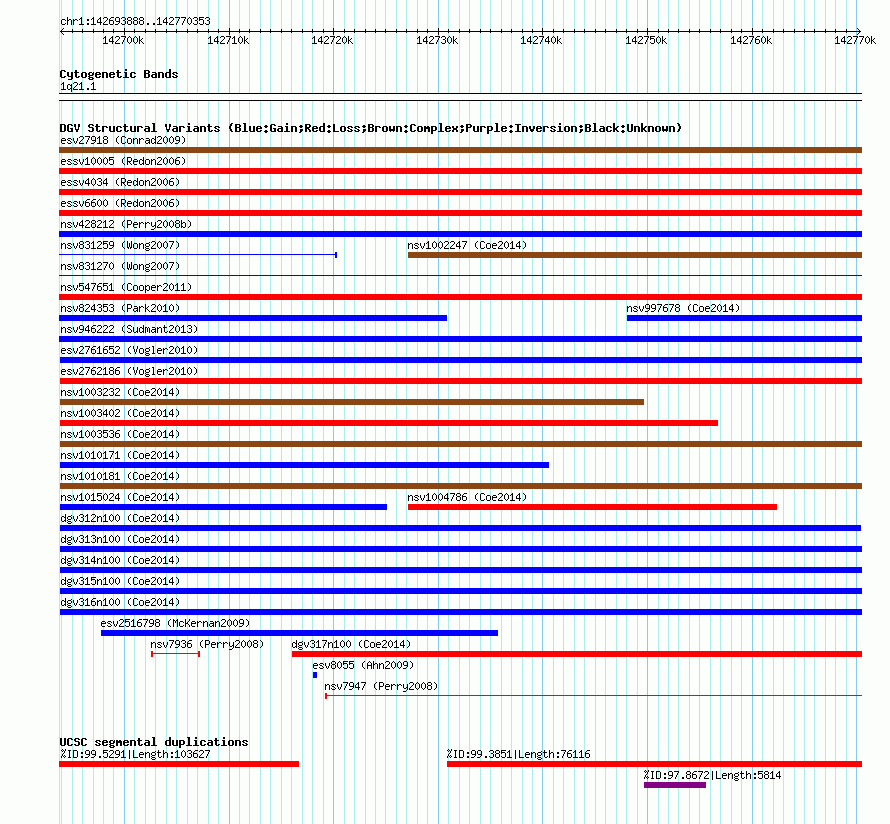 Variant DetailsVariant: dgv312n100| Internal ID | 20151928 | | Landmark | | | Location Information | | | Cytoband | 1q21.1 | | Allele length | | Assembly | Allele length | | hg38 | 73033 | | hg19 | 76467 | | hg18 | 76466 |