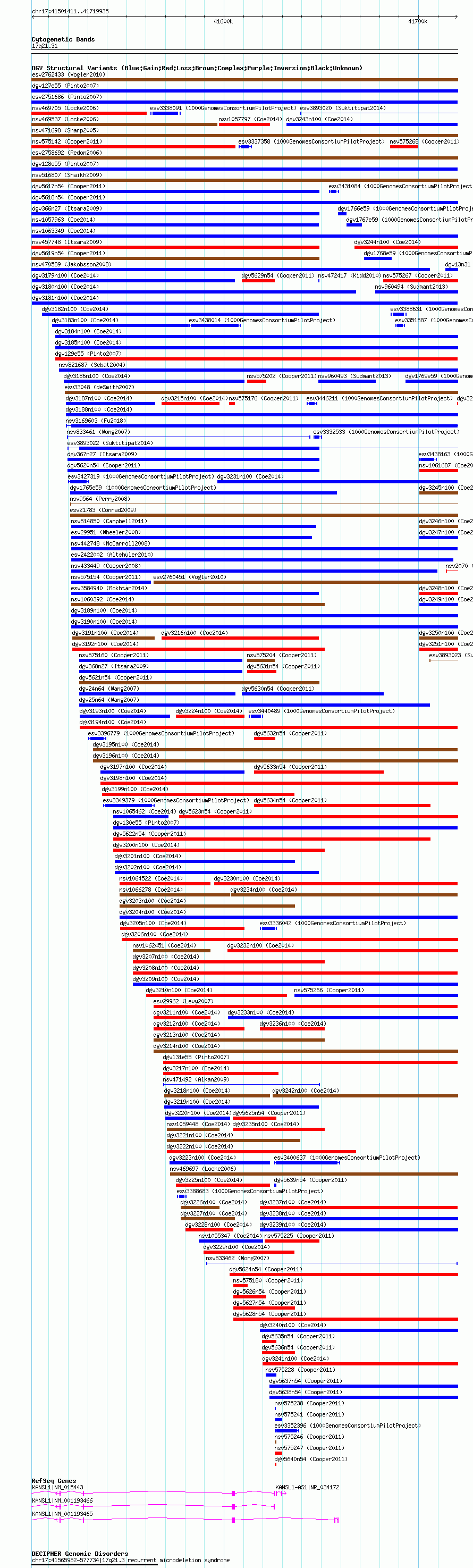 | | Variant Type | CNV gain | | Copy Number | | | Allele State | | | Allele Origin | | | Probe Count | | | Validation Flag | | | Merged Status | M | | Merged Variants | | | Supporting Variants | nsv1057256, nsv1067056, nsv1057638, nsv1061266, nsv1061713, nsv1064538, nsv1064796, nsv1059605, nsv1064373, nsv1055215, nsv1063221, nsv1056429, nsv1056074, nsv1060846, nsv1064548, nsv1057886, nsv1061484, nsv1065164, nsv1056260, nsv1061806, nsv1059239, nsv1065032, nsv1062113, nsv1057045, nsv1061883, nsv1055533, nsv1058676, nsv1057646, nsv1058569, nsv1063234, nsv1066681, nsv1062135, nsv1059546, nsv1064763, nsv1067221, nsv1061644, nsv1057289, nsv1065483, nsv1059408, nsv1065797, nsv1056098, nsv1061086, nsv1060875, nsv1063014 | | Samples | | | Known Genes | KANSL1, KANSL1-AS1, LOC644172 | | Method | SNP array | | Analysis | Affymetrix SNP array copy number analysis | | Platform | Affymetrix SNP Array 6.0 | | Comments | | | Reference | Coe_et_al_2014 | | Pubmed ID | 25217958 | | Accession Number(s) | dgv3181n100