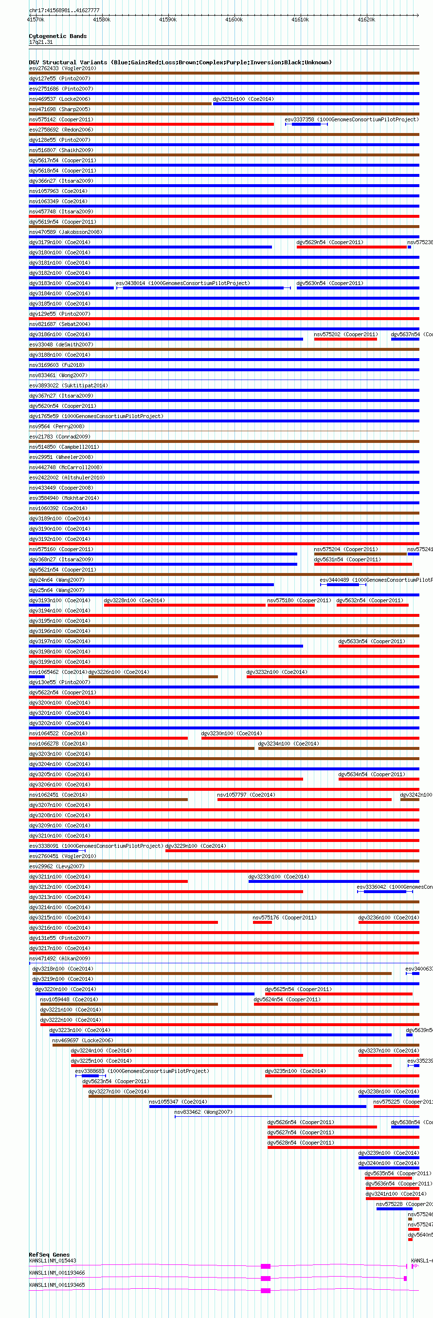 Variant DetailsVariant: dgv3217n100| Internal ID | 22789304 | | Landmark | | | Location Information | | | Cytoband | 17q21.31 | | Allele length | | Assembly | Allele length | | hg38 | 58797 | | hg19 | 58797 | | hg18 | 58797 |
