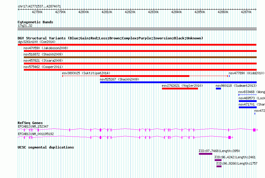 Variant DetailsVariant: dgv3261n100| Internal ID | 20154877 | | Landmark | | | Location Information | | | Cytoband | 17q21.32 | | Allele length | | Assembly | Allele length | | hg38 | 102535 | | hg19 | 102535 | | hg18 | 102535 |