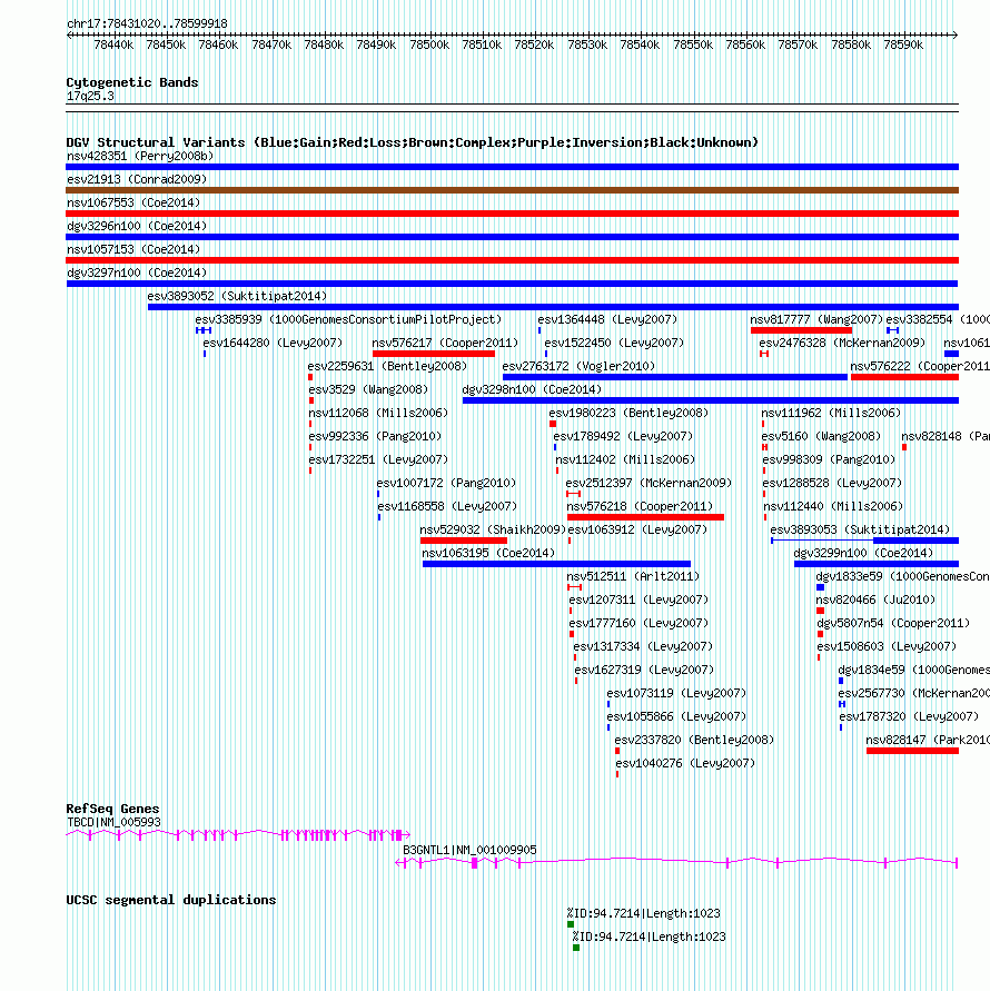 Variant DetailsVariant: dgv3297n100| Internal ID | 20154913 | | Landmark | | | Location Information | | | Cytoband | 17q25.3 | | Allele length | | Assembly | Allele length | | hg38 | 168899 | | hg19 | 168899 | | hg18 | 168899 |