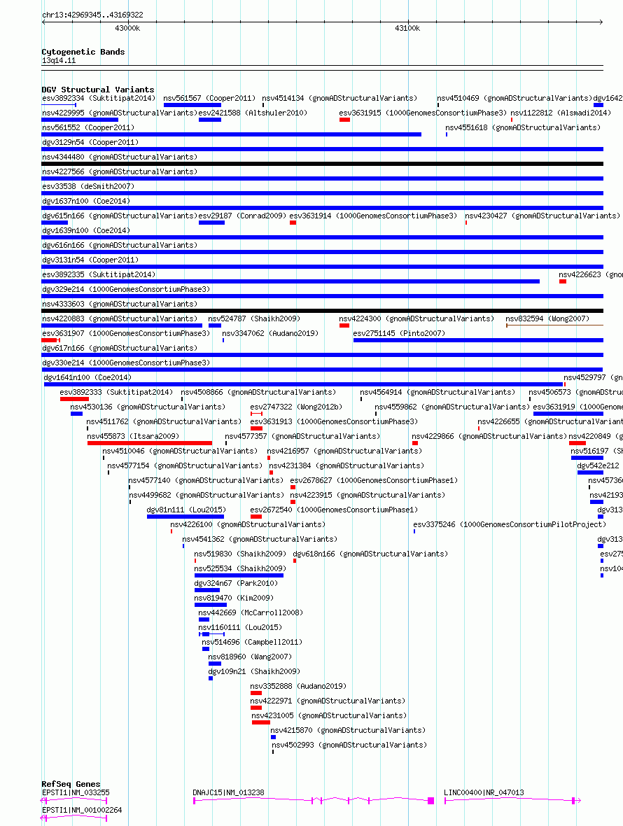 Variant DetailsVariant: dgv330e214| Internal ID | 20121753 | | Landmark | | | Location Information | | | Cytoband | 13q14.11 | | Allele length | | Assembly | Allele length | | hg38 | 199978 | | hg19 | 199978 |