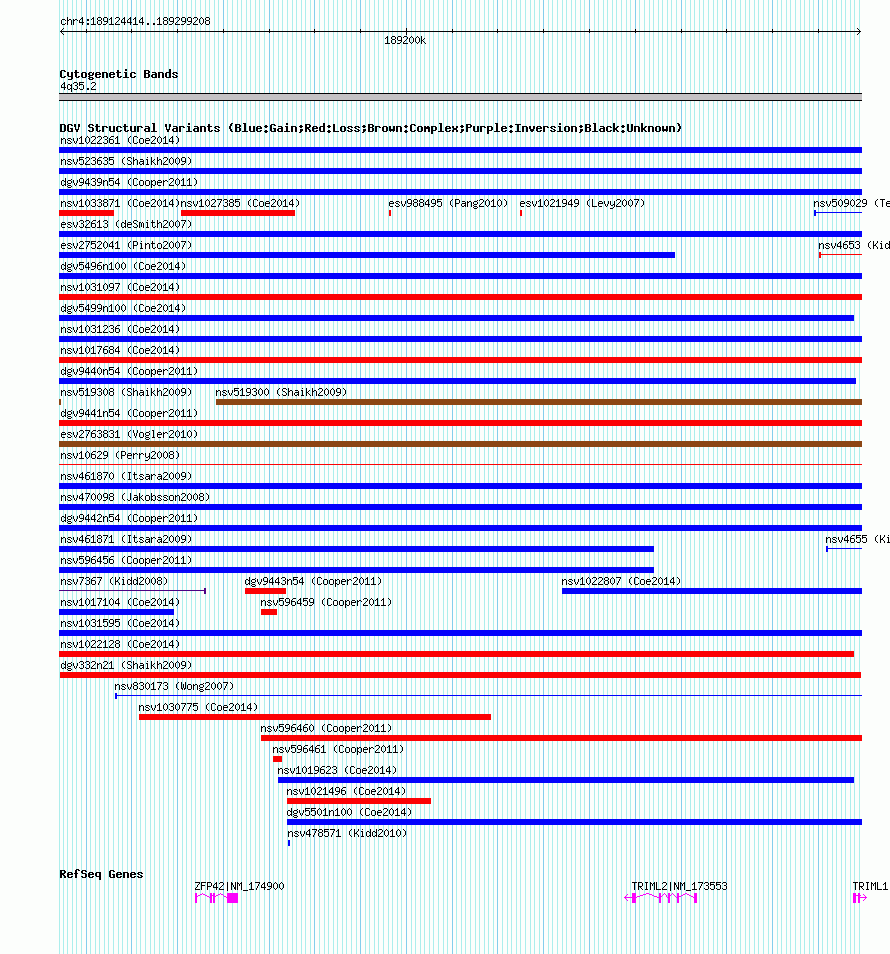 | Variant Type | CNV loss | Copy Number | | Allele State | | Allele Origin | | Probe Count | | Validation Flag | | Merged Status | M | Merged Variants | | Supporting Variants | nsv518420, nsv522793 | Samples | | Known Genes | TRIML1, TRIML2, ZFP42 | Method | SNP array | Analysis | Sample-level CNVs | Platform | GPL6434 | Comments | | Reference | Shaikh_et_al_2009 | Pubmed ID | 19592680 | Accession Number(s) | dgv332n21