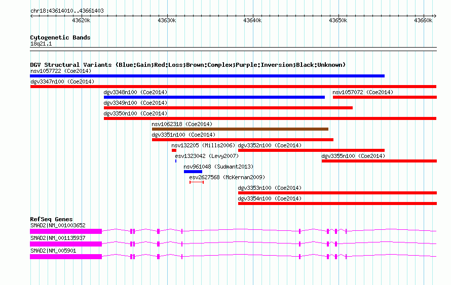 | | Variant Type | CNV loss | | Copy Number | | | Allele State | | | Allele Origin | | | Probe Count | | | Validation Flag | | | Merged Status | M | | Merged Variants | | | Supporting Variants | nsv1059186, nsv1058673 | | Samples | | | Known Genes | SMAD2 | | Method | SNP array | | Analysis | Affymetrix SNP array copy number analysis | | Platform | Affymetrix SNP Array 6.0 | | Comments | | | Reference | Coe_et_al_2014 | | Pubmed ID | 25217958 | | Accession Number(s) | dgv3347n100
