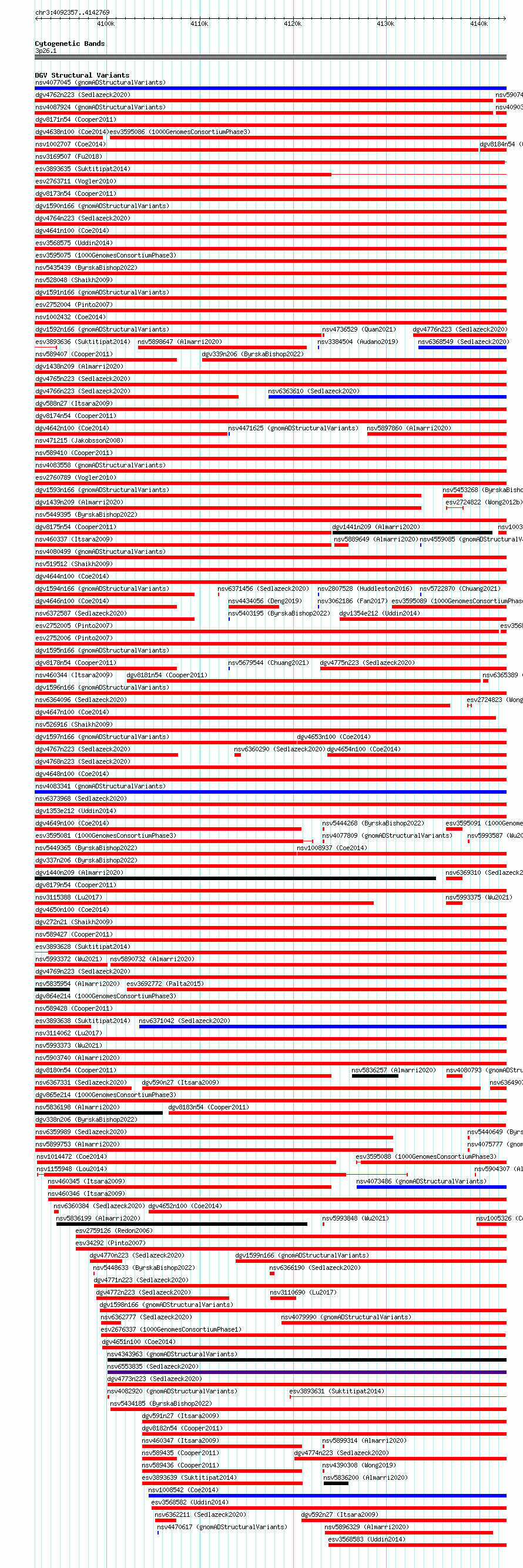 Variant DetailsVariant: dgv338n206| Internal ID | 22755642 | | Landmark | | | Location Information | | | Cytoband | 3p26.1 | | Allele length | | Assembly | Allele length | | hg38 | 50413 | | hg19 | 50413 |