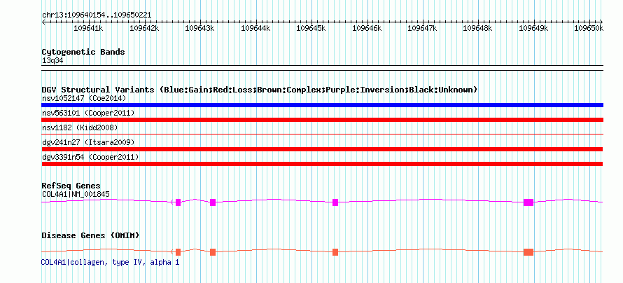 | | Variant Type | CNV loss | | Copy Number | | | Allele State | | | Allele Origin | | | Probe Count | | | Validation Flag | | | Merged Status | M | | Merged Variants | | | Supporting Variants | nsv563103, nsv563102 | | Samples | HGDP00857, HGDP00868 | | Known Genes | COL4A1 | | Method | SNP array | | Analysis | Illumina SNP array copy number analysis | | Platform | Not reported | | Comments | | | Reference | Cooper_et_al_2011 | | Pubmed ID | 21841781 | | Accession Number(s) | dgv3391n54