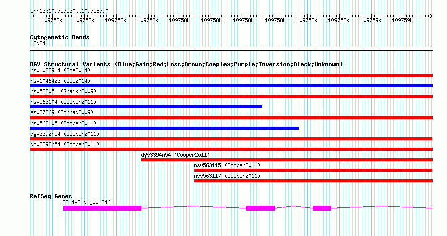 | | Variant Type | CNV loss | | Copy Number | | | Allele State | | | Allele Origin | | | Probe Count | | | Validation Flag | | | Merged Status | M | | Merged Variants | | | Supporting Variants | nsv563110, nsv563106, nsv563111, nsv563112, nsv563107 | | Samples | | | Known Genes | COL4A2 | | Method | SNP array | | Analysis | Illumina SNP array copy number analysis | | Platform | Not reported | | Comments | | | Reference | Cooper_et_al_2011 | | Pubmed ID | 21841781 | | Accession Number(s) | dgv3392n54