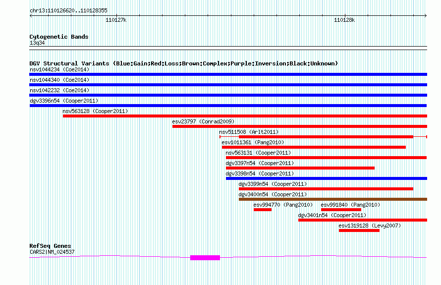 | | Variant Type | CNV gain | | Copy Number | | | Allele State | | | Allele Origin | | | Probe Count | | | Validation Flag | | | Merged Status | M | | Merged Variants | | | Supporting Variants | nsv563126, nsv563127 | | Samples | | | Known Genes | CARS2 | | Method | SNP array | | Analysis | Illumina SNP array copy number analysis | | Platform | Not reported | | Comments | | | Reference | Cooper_et_al_2011 | | Pubmed ID | 21841781 | | Accession Number(s) | dgv3396n54