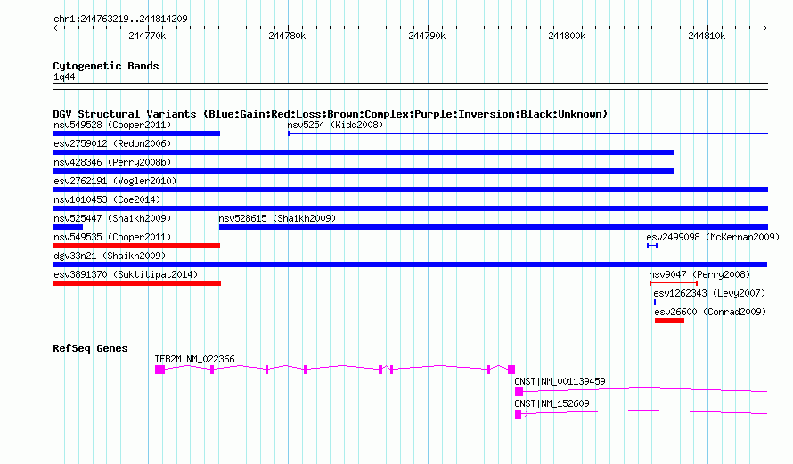 Variant DetailsVariant: dgv33n21| Internal ID | 22766225 | | Landmark | | | Location Information | | | Cytoband | 1q44 | | Allele length | | Assembly | Allele length | | hg38 | 50991 | | hg19 | 50991 | | hg18 | 50991 | | hg17 | 50991 |