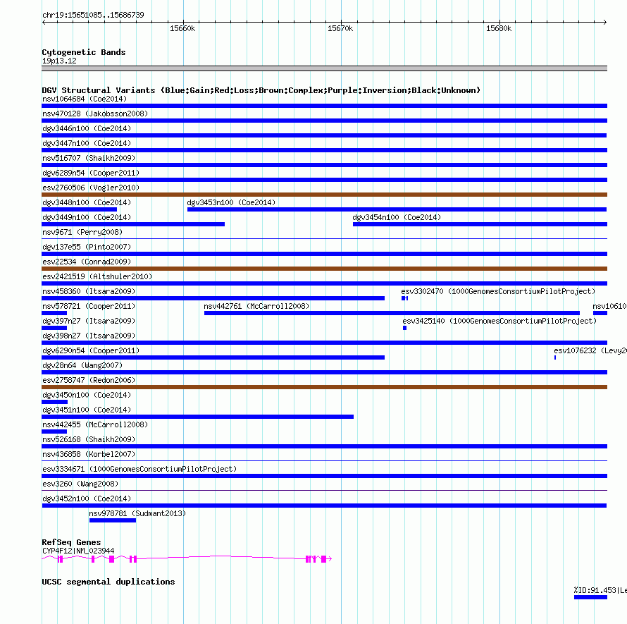 Variant DetailsVariant: dgv3452n100| Internal ID | 20155068 | | Landmark | | | Location Information | | | Cytoband | 19p13.12 | | Allele length | | Assembly | Allele length | | hg38 | 35655 | | hg19 | 35655 | | hg18 | 35655 |