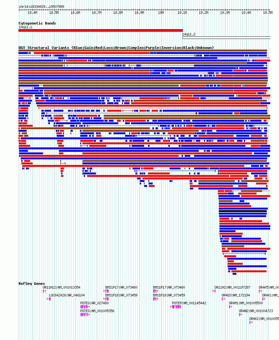 Variant DetailsVariant: dgv3489n54| Internal ID | 22771384 | | Landmark | | | Location Information | | | Cytoband | 14q11.1 | | Allele length | | Assembly | Allele length | | hg38 | 1481539 | | hg19 | 1173221 | | hg18 | 1173061 |