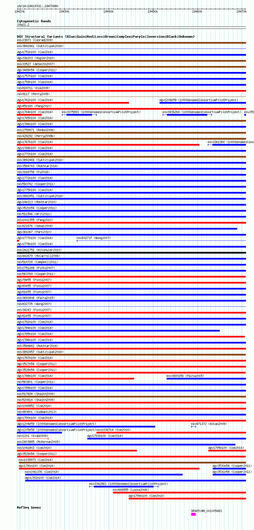 Variant DetailsVariant: dgv3529n54| Internal ID | 22771424 | | Landmark | | | Location Information | | | Cytoband | 14q11.2 | | Allele length | | Assembly | Allele length | | hg38 | 51509 | | hg19 | 51509 | | hg18 | 51509 |