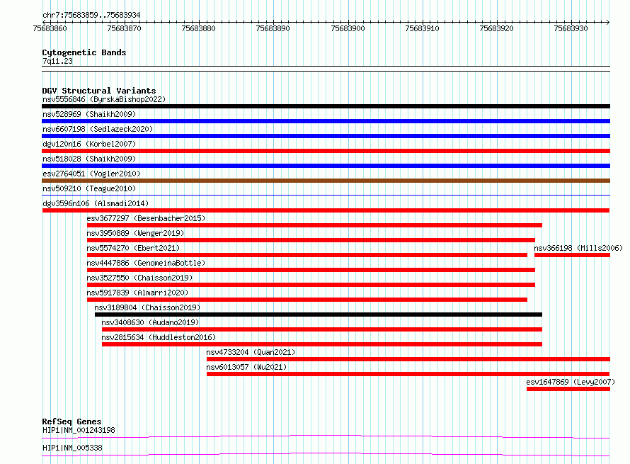 Variant DetailsVariant: dgv3596n106| Internal ID | 22797424 | | Landmark | | | Location Information | | | Cytoband | 7q11.23 | | Allele length | | Assembly | Allele length | | hg38 | 76 | | hg19 | 76 |