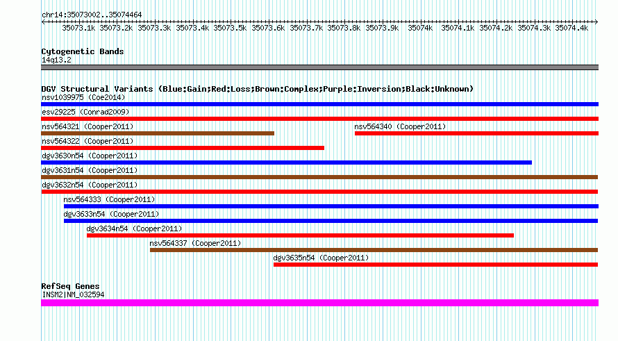 Variant DetailsVariant: dgv3632n54| Internal ID | 22771527 | | Landmark | | | Location Information | | | Cytoband | 14q13.2 | | Allele length | | Assembly | Allele length | | hg38 | 1463 | | hg19 | 1463 | | hg18 | 1463 |