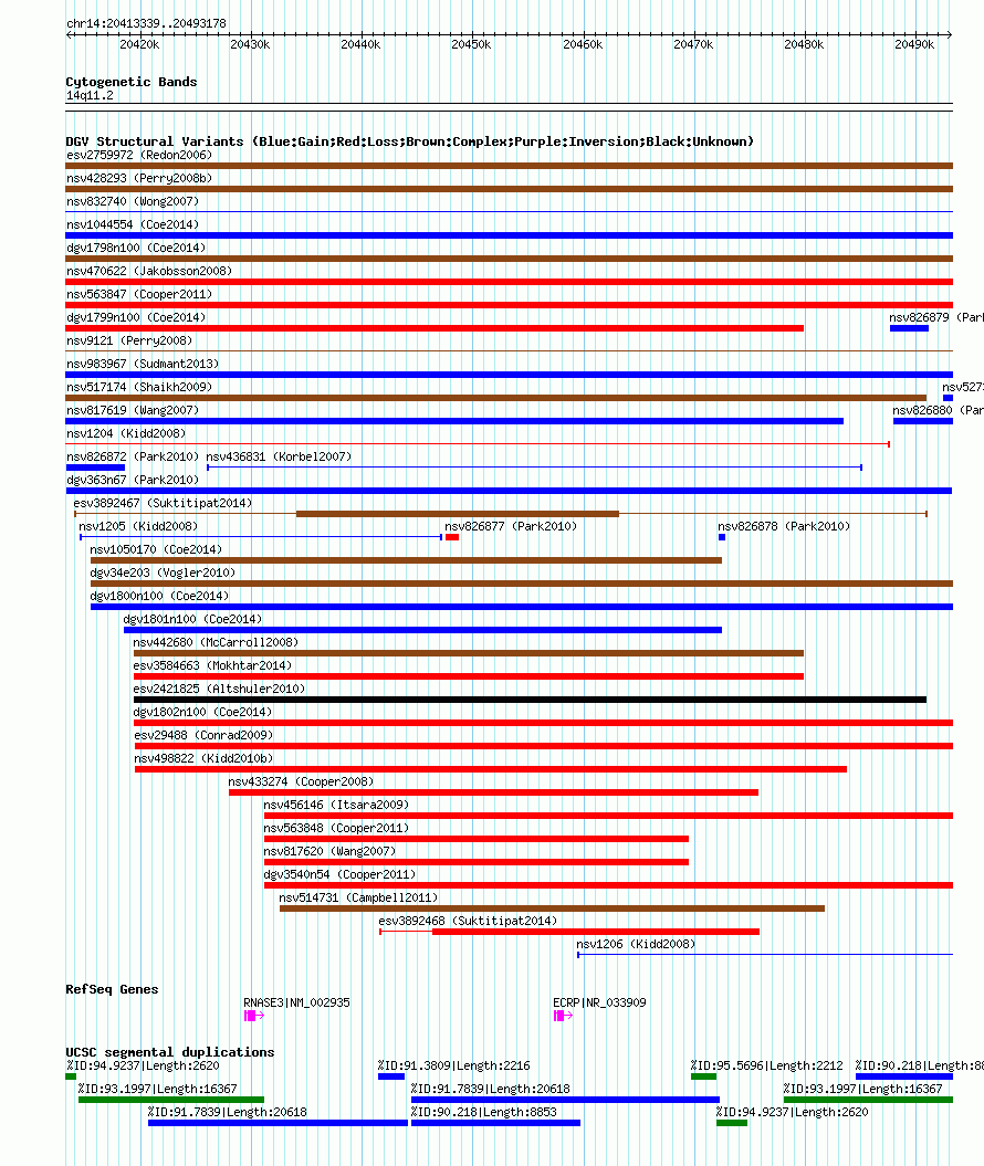 Variant DetailsVariant: dgv363n67 Internal ID | 20146875 | Landmark | | Location Information | | Cytoband | 14q11.2 | Allele length | Assembly | Allele length | hg38 | 79840 | hg19 | 79840 | hg18 | 79840 |