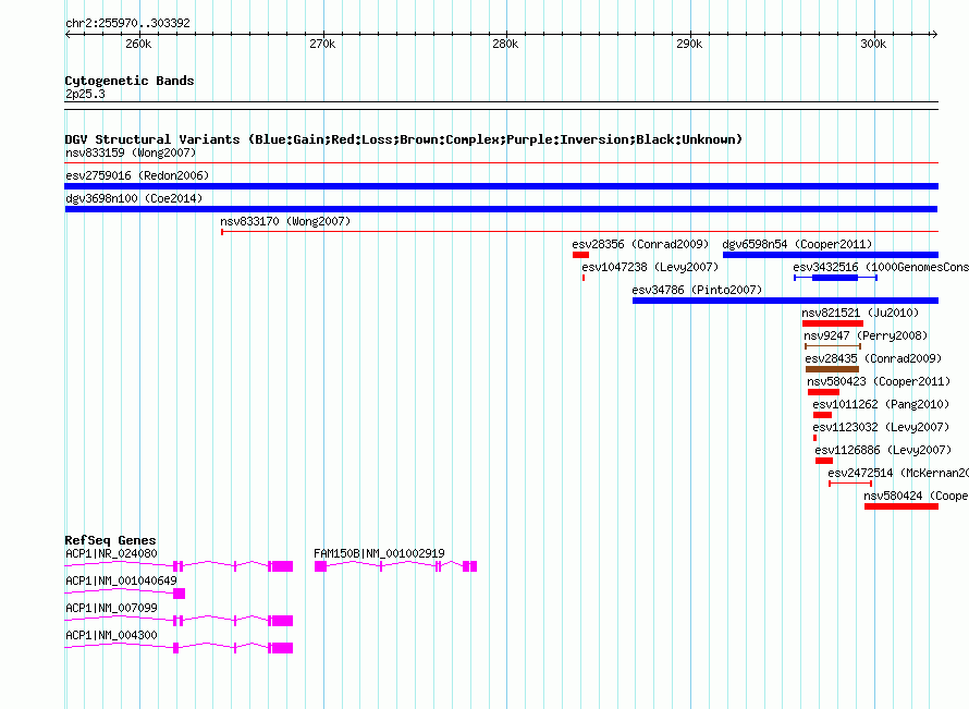 Variant DetailsVariant: dgv3698n100| Internal ID | 22789785 | | Landmark | | | Location Information | | | Cytoband | 2p25.3 | | Allele length | | Assembly | Allele length | | hg38 | 47423 | | hg19 | 47423 | | hg18 | 47423 |