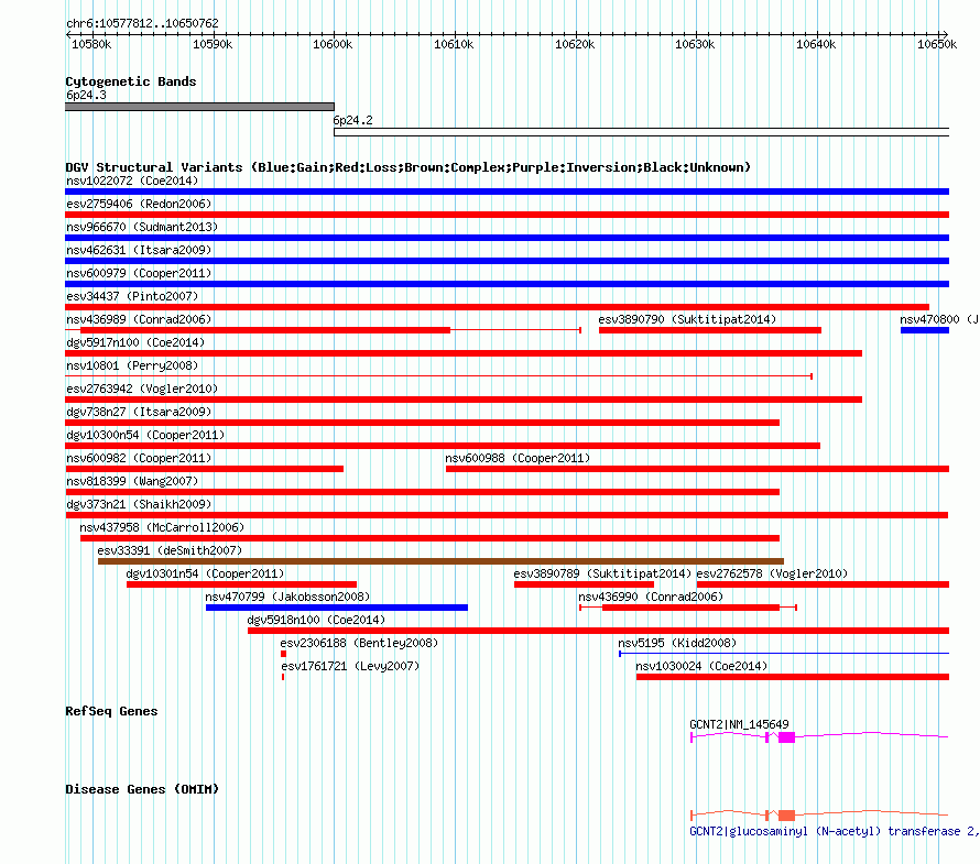 | Variant Type | CNV loss | Copy Number | | Allele State | | Allele Origin | | Probe Count | | Validation Flag | | Merged Status | M | Merged Variants | | Supporting Variants | nsv522231, nsv520598 | Samples | | Known Genes | GCNT2 | Method | SNP array | Analysis | Sample-level CNVs | Platform | GPL6434 | Comments | | Reference | Shaikh_et_al_2009 | Pubmed ID | 19592680 | Accession Number(s) | dgv373n21