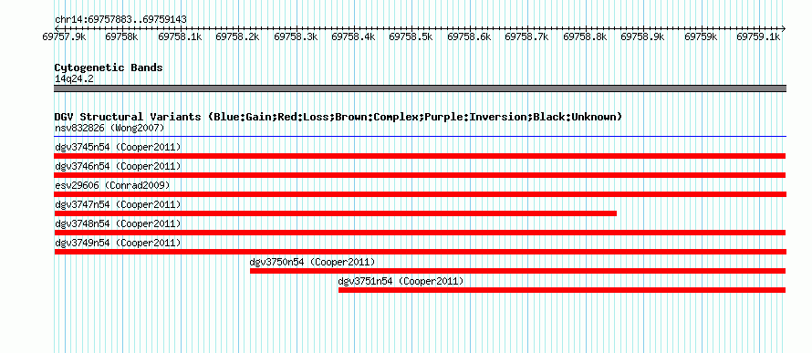 Variant DetailsVariant: dgv3748n54| Internal ID | 22771643 | | Landmark | | | Location Information | | | Cytoband | 14q24.2 | | Allele length | | Assembly | Allele length | | hg38 | 1261 | | hg19 | 1261 | | hg18 | 1261 |