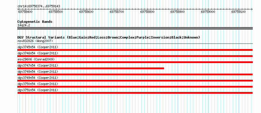 Variant DetailsVariant: dgv3751n54| Internal ID | 22771646 | | Landmark | | | Location Information | | | Cytoband | 14q24.2 | | Allele length | | Assembly | Allele length | | hg38 | 770 | | hg19 | 770 | | hg18 | 770 |
