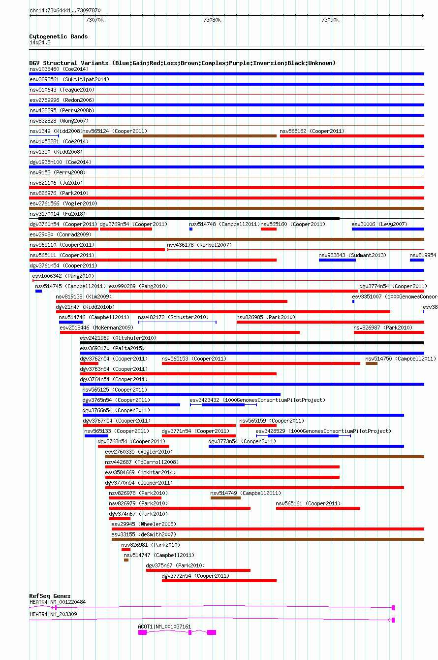 | | Variant Type | CNV gain | | Copy Number | | | Allele State | | | Allele Origin | | | Probe Count | | | Validation Flag | | | Merged Status | M | | Merged Variants | | | Supporting Variants | nsv565113, nsv565114, nsv565112 | | Samples | | | Known Genes | ACOT1, HEATR4 | | Method | SNP array | | Analysis | Illumina SNP array copy number analysis | | Platform | Not reported | | Comments | | | Reference | Cooper_et_al_2011 | | Pubmed ID | 21841781 | | Accession Number(s) | dgv3761n54