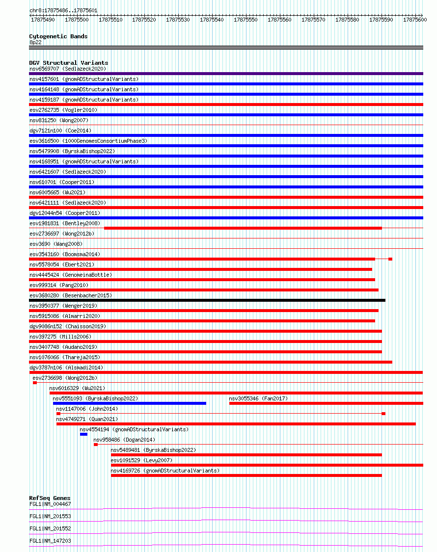 | | Variant Type | CNV deletion | | Copy Number | | | Allele State | | | Allele Origin | | | Probe Count | | | Validation Flag | | | Merged Status | M | | Merged Variants | | | Supporting Variants | nsv1135699, nsv1128103, nsv1130148 | | Samples | KWS2, KWS1 | | Known Genes | FGL1 | | Method | Sequencing | | Analysis | HugeSeq | | Platform | Illumina HiSeq 2000 | | Comments | | | Reference | Alsmadi_et_al_2014 | | Pubmed ID | 24896259 | | Accession Number(s) | dgv3787n106