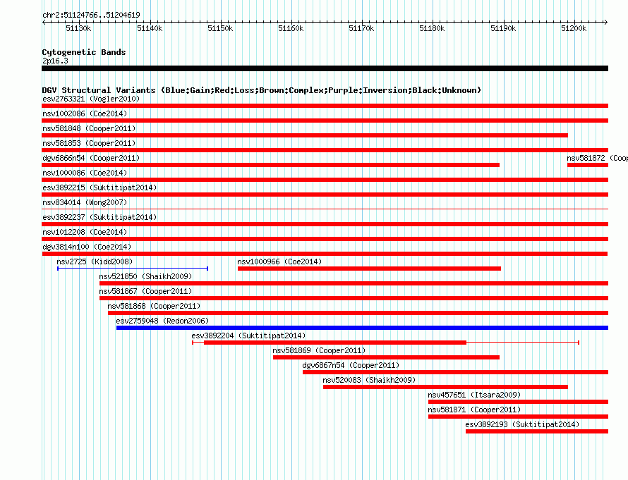 Variant DetailsVariant: dgv3814n100| Internal ID | 22789901 | | Landmark | | | Location Information | | | Cytoband | 2p16.3 | | Allele length | | Assembly | Allele length | | hg38 | 79854 | | hg19 | 79854 | | hg18 | 79854 |