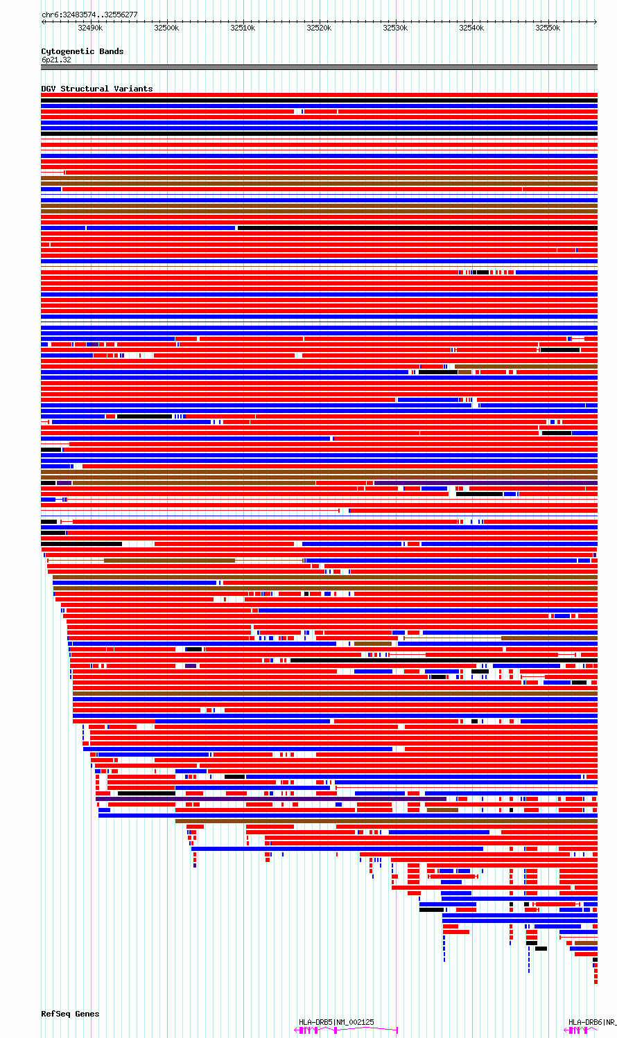 Variant DetailsVariant: dgv384e215| Internal ID | 22785894 | | Landmark | | | Location Information | | | Cytoband | 6p21.32 | | Allele length | | Assembly | Allele length | | hg38 | 72704 | | hg19 | 72704 |