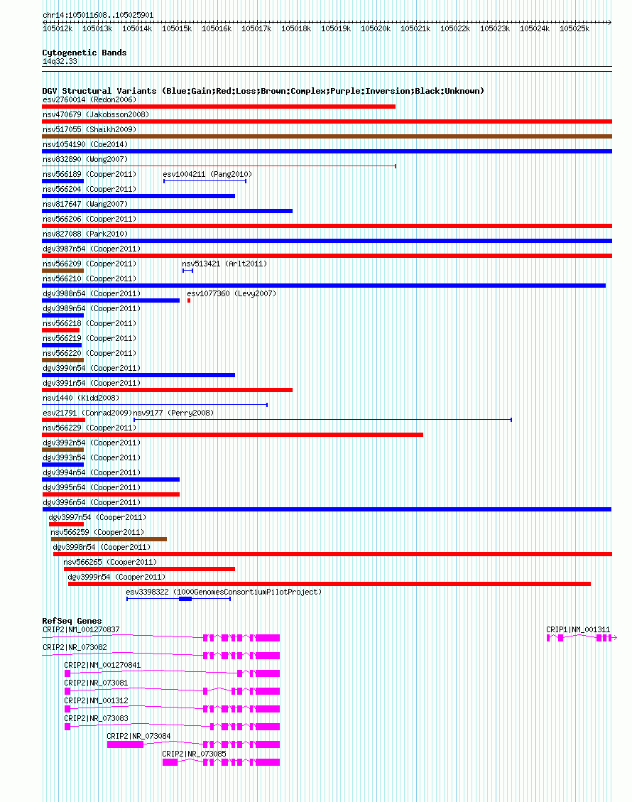 | | Variant Type | CNV gain | | Copy Number | | | Allele State | | | Allele Origin | | | Probe Count | | | Validation Flag | | | Merged Status | M | | Merged Variants | | | Supporting Variants | nsv566256, nsv566237, nsv566250 | | Samples | | | Known Genes | CRIP1, CRIP2 | | Method | SNP array | | Analysis | Illumina SNP array copy number analysis | | Platform | Not reported | | Comments | | | Reference | Cooper_et_al_2011 | | Pubmed ID | 21841781 | | Accession Number(s) | dgv3996n54