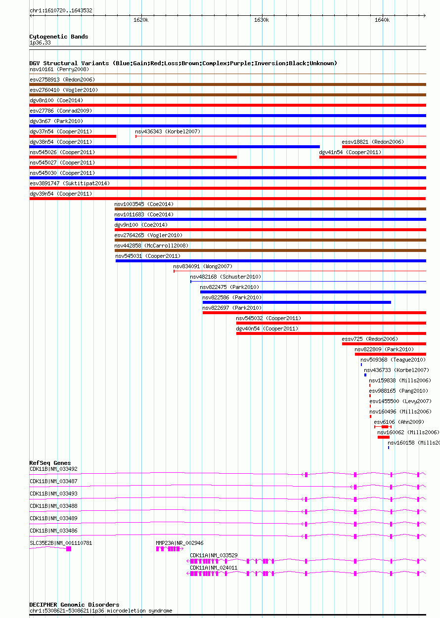 Variant DetailsVariant: dgv39n54| Internal ID | 22767934 | | Landmark | | | Location Information | | | Cytoband | 1p36.33 | | Allele length | | Assembly | Allele length | | hg38 | 32812 | | hg19 | 32812 | | hg18 | 32813 |