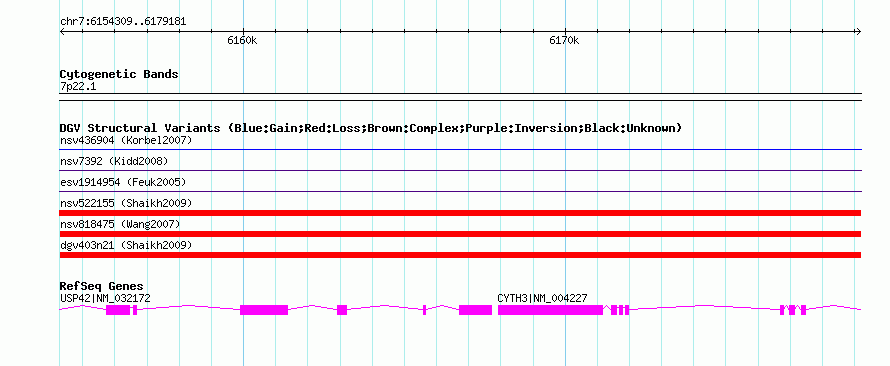 |  | Variant Type | CNV loss |  | Copy Number |  |  | Allele State |  |  | Allele Origin |  |  | Probe Count |  |  | Validation Flag |  |  | Merged Status | M |  | Merged Variants |  |  | Supporting Variants | nsv522217, nsv527386 |  | Samples |  |  | Known Genes | CYTH3, USP42 |  | Method | SNP array |  | Analysis | Sample-level CNVs |  | Platform | GPL6434 |  | Comments |  |  | Reference | Shaikh_et_al_2009 |  | Pubmed ID | 19592680 |  | Accession Number(s) | dgv403n21