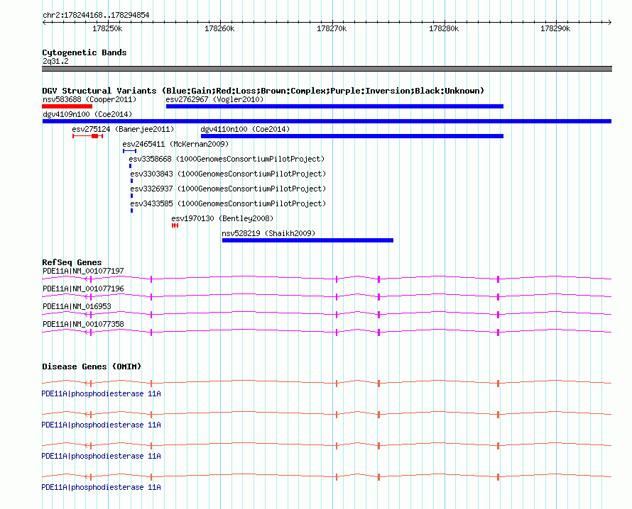 | | Variant Type | CNV gain | | Copy Number | | | Allele State | | | Allele Origin | | | Probe Count | | | Validation Flag | | | Merged Status | M | | Merged Variants | | | Supporting Variants | nsv1007925, nsv1005854 | | Samples | | | Known Genes | PDE11A | | Method | SNP array | | Analysis | Affymetrix SNP array copy number analysis | | Platform | Affymetrix SNP Array 6.0 | | Comments | | | Reference | Coe_et_al_2014 | | Pubmed ID | 25217958 | | Accession Number(s) | dgv4109n100