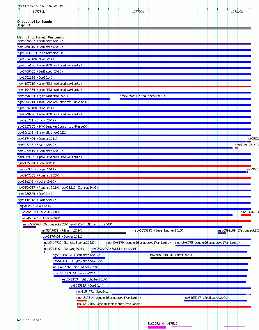 Variant DetailsVariant: dgv414e212| Internal ID | 22783341 | | Landmark | | | Location Information | | | Cytoband | 11q22.3 | | Allele length | | Assembly | Allele length | | hg38 | 23494 | | hg19 | 23494 |