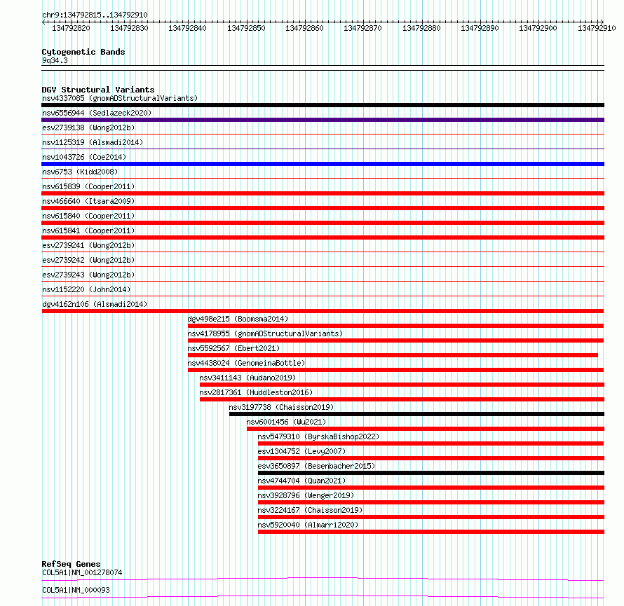 Variant DetailsVariant: dgv4162n106| Internal ID | 22797990 | | Landmark | | | Location Information | | | Cytoband | 9q34.3 | | Allele length | | Assembly | Allele length | | hg38 | 96 | | hg19 | 96 |