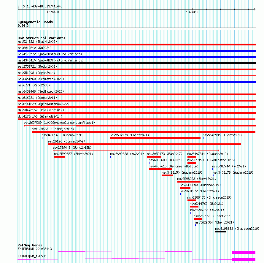 | | Variant Type | CNV deletion | | Copy Number | | | Allele State | | | Allele Origin | | | Probe Count | | | Validation Flag | | | Merged Status | M | | Merged Variants | | | Supporting Variants | nsv1122252, nsv1126932 | | Samples | KWS2, KWS1 | | Known Genes | ENTPD8 | | Method | Sequencing | | Analysis | HugeSeq | | Platform | Illumina HiSeq 2000 | | Comments | | | Reference | Alsmadi_et_al_2014 | | Pubmed ID | 24896259 | | Accession Number(s) | dgv4178n106