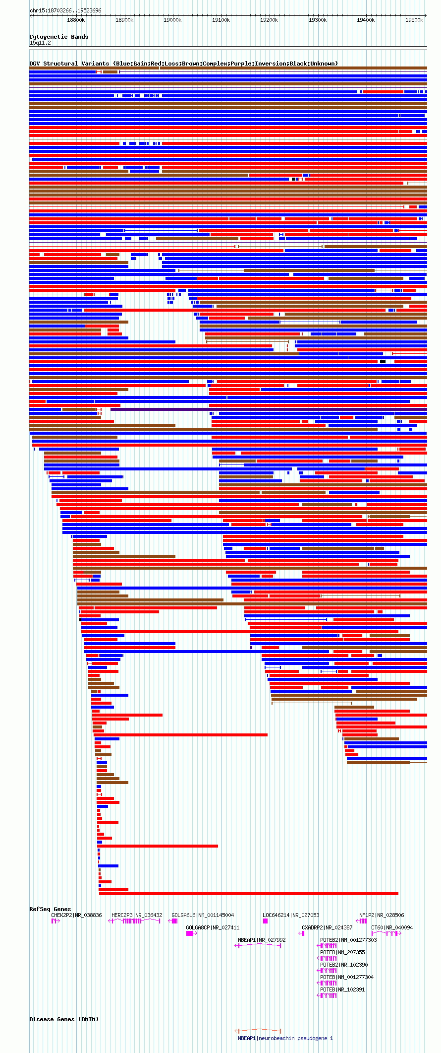 Variant DetailsVariant: dgv4180n54| Internal ID | 22772075 | | Landmark | | | Location Information | | | Cytoband | 15q11.1 | | Allele length | | Assembly | Allele length | | hg38 | 815710 | | hg19 | 815786 | | hg18 | 820431 |