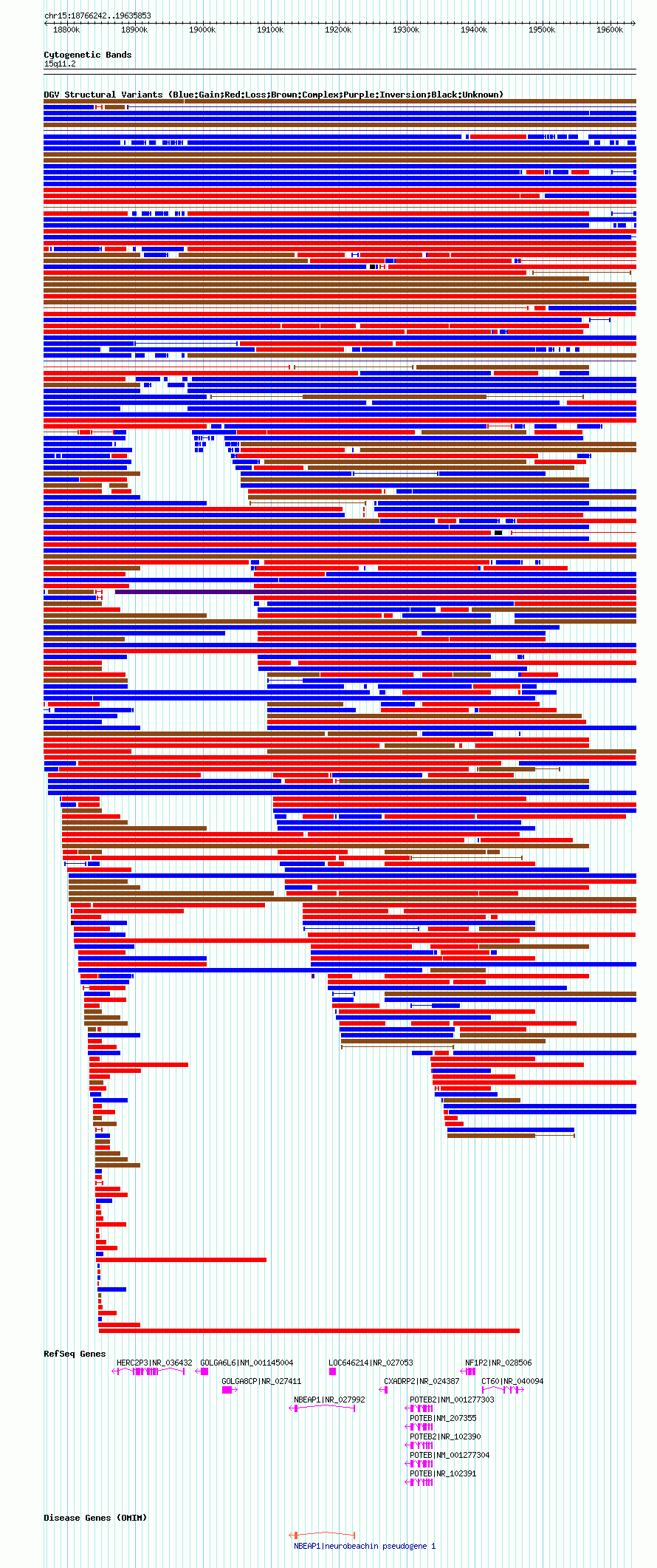Variant DetailsVariant: dgv4182n54| Internal ID | 22772077 | | Landmark | | | Location Information | | | Cytoband | 15q11.1 | | Allele length | | Assembly | Allele length | | hg38 | 864891 | | hg19 | 864967 | | hg18 | 869612 |