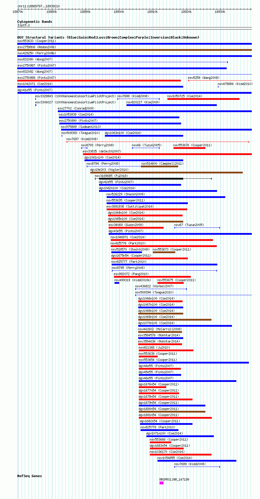 Variant DetailsVariant: dgv41e55| Internal ID | 22760991 | | Landmark | | | Location Information | | | Cytoband | 11p15.1 | | Allele length | | Assembly | Allele length | | hg38 | 69414 | | hg19 | 69414 | | hg18 | 69414 | | hg17 | 69414 |