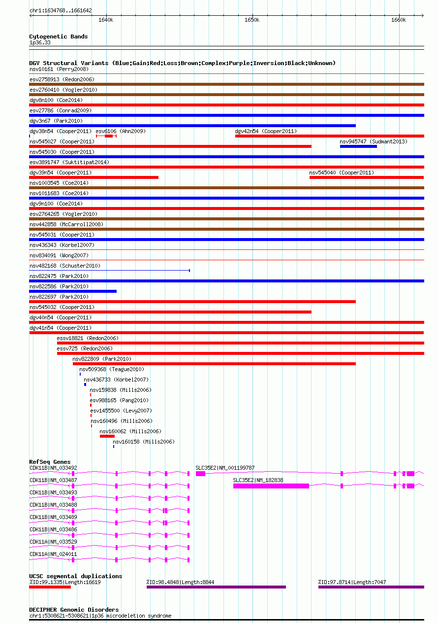 | Variant Type | CNV loss | Copy Number | | Allele State | | Allele Origin | | Probe Count | | Validation Flag | | Merged Status | M | Merged Variants | | Supporting Variants | nsv545035, nsv545036 | Samples | | Known Genes | CDK11A, CDK11B, SLC35E2 | Method | SNP array | Analysis | Illumina SNP array copy number analysis | Platform | Not reported | Comments | | Reference | Cooper_et_al_2011 | Pubmed ID | 21841781 | Accession Number(s) | dgv41n54