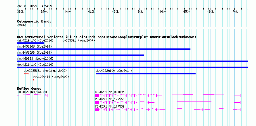 | | Variant Type | CNV gain | | Copy Number | | | Allele State | | | Allele Origin | | | Probe Count | | | Validation Flag | | | Merged Status | M | | Merged Variants | | | Supporting Variants | nsv1055352, nsv1063600 | | Samples | | | Known Genes | CSNK2A1, TBC1D20 | | Method | SNP array | | Analysis | Affymetrix SNP array copy number analysis | | Platform | Affymetrix SNP Array 6.0 | | Comments | | | Reference | Coe_et_al_2014 | | Pubmed ID | 25217958 | | Accession Number(s) | dgv4221n100