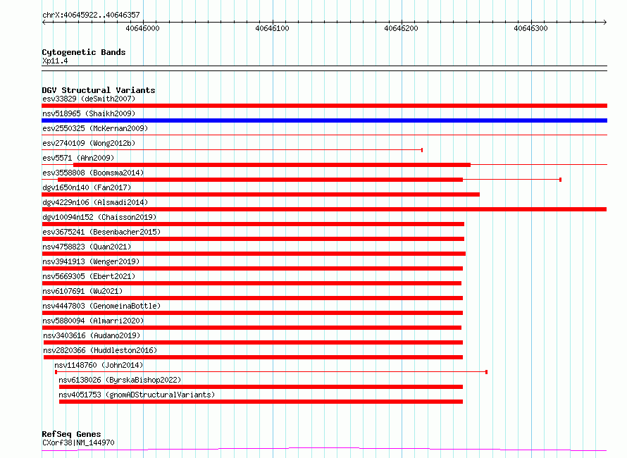 Variant DetailsVariant: dgv4229n106| Internal ID | 22798057 | | Landmark | | | Location Information | | | Cytoband | Xp11.4 | | Allele length | | Assembly | Allele length | | hg38 | 436 | | hg19 | 436 |