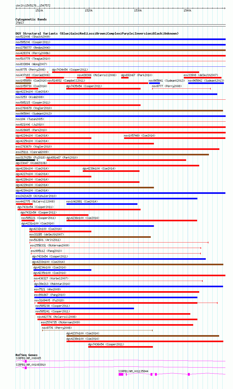 Variant DetailsVariant: dgv4230n100| Internal ID | 22790317 | | Landmark | | | Location Information | | | Cytoband | 20p13 | | Allele length | | Assembly | Allele length | | hg38 | 42395 | | hg19 | 42395 | | hg18 | 42395 |