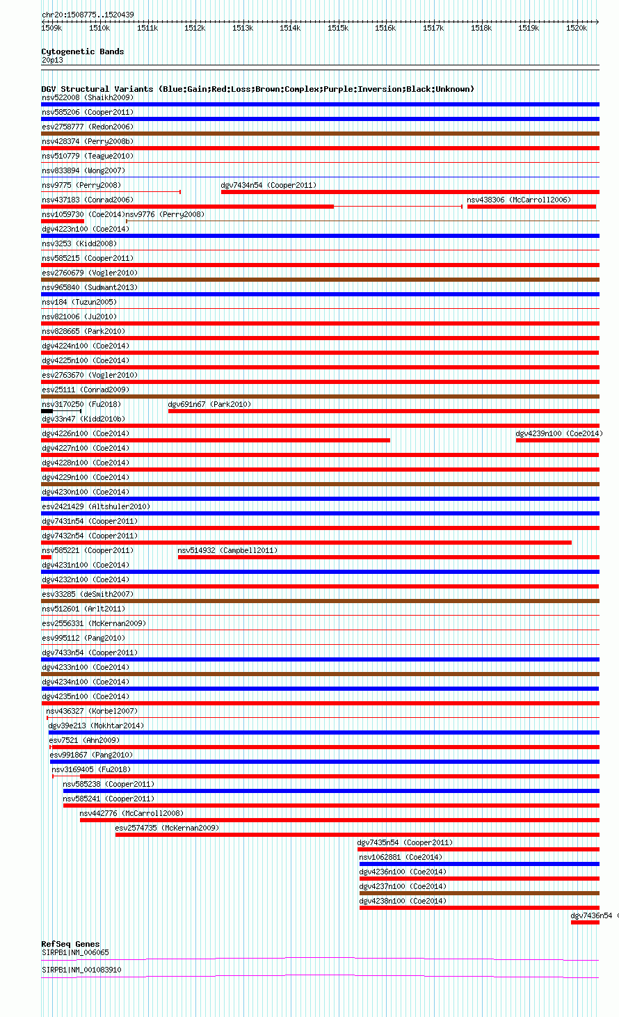 | | Variant Type | CNV gain | | Copy Number | | | Allele State | | | Allele Origin | | | Probe Count | | | Validation Flag | | | Merged Status | M | | Merged Variants | | | Supporting Variants | nsv1059108, nsv1066372 | | Samples | | | Known Genes | SIRPB1 | | Method | SNP array | | Analysis | Affymetrix SNP array copy number analysis | | Platform | Affymetrix SNP Array 6.0 | | Comments | | | Reference | Coe_et_al_2014 | | Pubmed ID | 25217958 | | Accession Number(s) | dgv4234n100