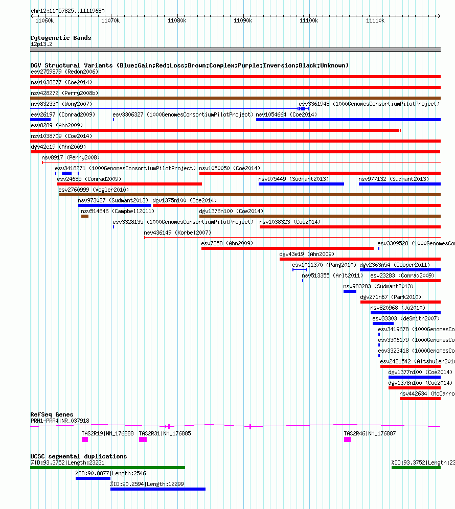Variant DetailsVariant: dgv42e19 | Internal ID | 20124751 | | Landmark | | | Location Information | | | Cytoband | 12p13.2 | | Allele length | | Assembly | Allele length | | hg38 | 61856 | | hg19 | 61856 | | hg18 | 61856 |
