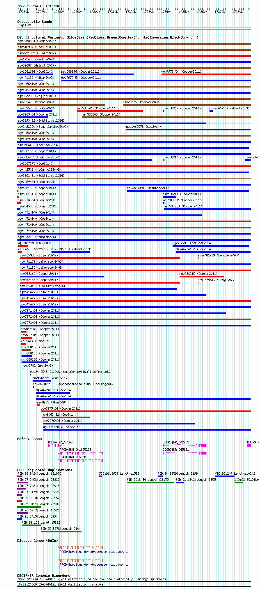 | Variant Type | CNV gain | Copy Number | | Allele State | | Allele Origin | | Probe Count | | Validation Flag | | Merged Status | M | Merged Variants | | Supporting Variants | esv3584487, esv3584490, esv3584489, esv3584486 | Samples | OA005, OA092, 1WS, OA020 | Known Genes | DGCR5, DGCR6, DGCR9, PRODH | Method | SNP array | Analysis | We applied stringent filtering criteria such that CNV had to be a minimum of 1 kb and span 5 consecutive probes, and be detected by at least 2 out of the 3 algorithms. In addition we excluded CNVs that were on the X and Y-chromosomes, or approximately 300 kb adjacent to the centromeres and telomeres. | Platform | Affymetrix Genome-Wide Human SNP Array 6.0 | Comments | | Reference | Mokhtar_et_al_2014 | Pubmed ID | 24956385 | Accession Number(s) | dgv42e213