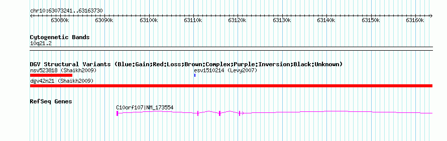 Variant DetailsVariant: dgv42n21| Internal ID | 20131763 | | Landmark | | | Location Information | | | Cytoband | 10q21.2 | | Allele length | | Assembly | Allele length | | hg38 | 90490 | | hg19 | 90490 | | hg18 | 90490 | | hg17 | 90490 |