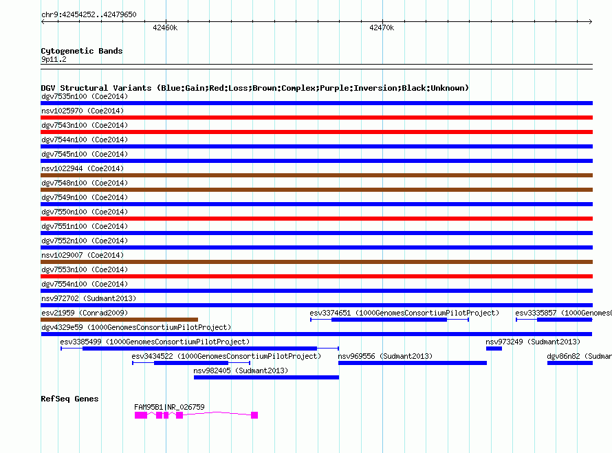Variant DetailsVariant: dgv4329e59| Internal ID | 22765549 | | Landmark | | | Location Information | | | Cytoband | 9p11.2 | | Allele length | | Assembly | Allele length | | hg38 | 25399 | | hg19 | 25399 | | hg18 | 25399 |