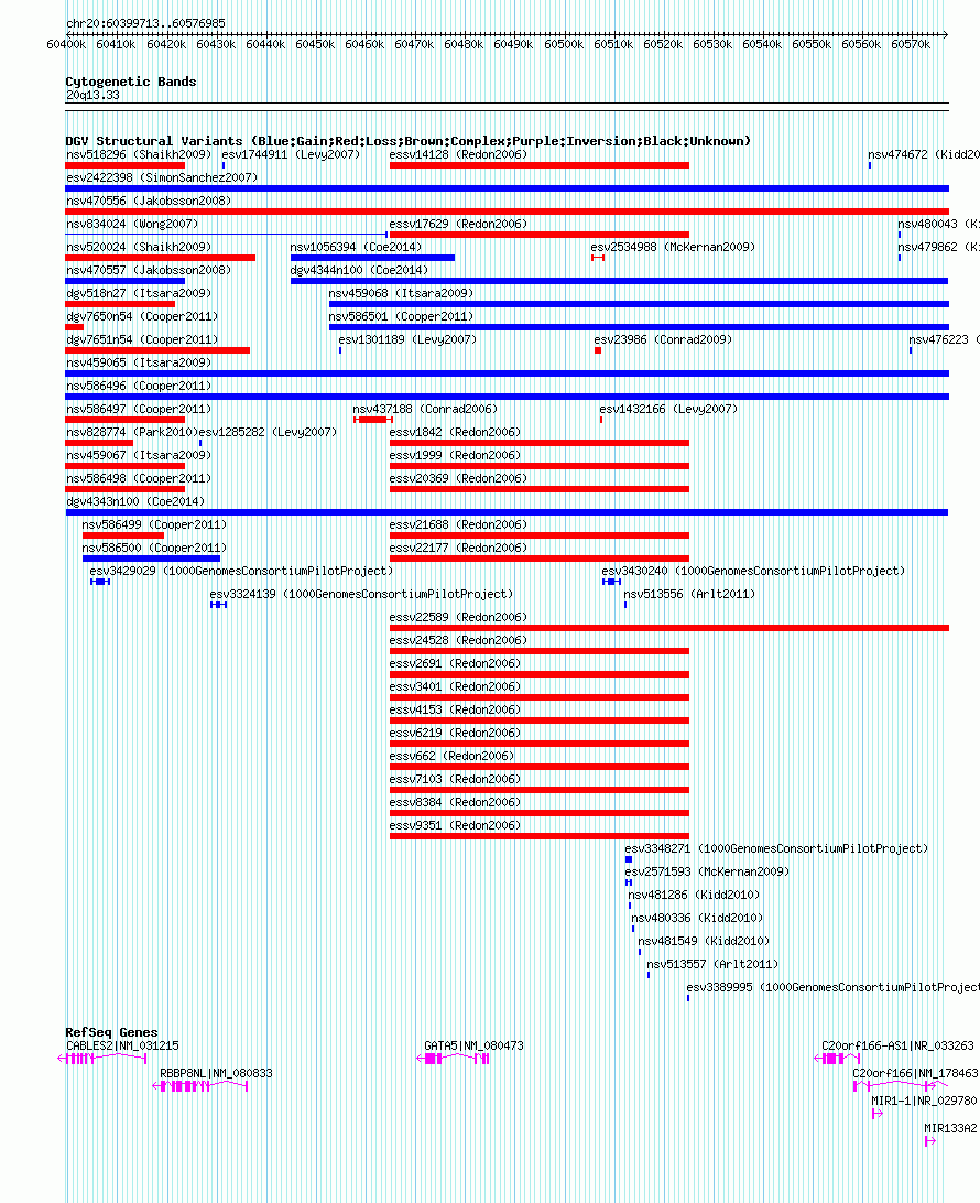 | | Variant Type | CNV gain | | Copy Number | | | Allele State | | | Allele Origin | | | Probe Count | | | Validation Flag | | | Merged Status | M | | Merged Variants | | | Supporting Variants | nsv1065160, nsv1056262, nsv1063674, nsv1065364, nsv1060968 | | Samples | | | Known Genes | C20orf166, C20orf166-AS1, CABLES2, GATA5, MIR1-1, MIR133A2, RBBP8NL | | Method | SNP array | | Analysis | Affymetrix SNP array copy number analysis | | Platform | Affymetrix SNP Array 6.0 | | Comments | | | Reference | Coe_et_al_2014 | | Pubmed ID | 25217958 | | Accession Number(s) | dgv4343n100