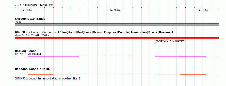 | | Variant Type | CNV loss | | Copy Number | | | Allele State | | | Allele Origin | | | Probe Count | | | Validation Flag | | | Merged Status | M | | Merged Variants | | | Supporting Variants | nsv527018, nsv516942 | | Samples | | | Known Genes | CNTNAP2 | | Method | SNP array | | Analysis | Sample-level CNVs | | Platform | GPL6434 | | Comments | | | Reference | Shaikh_et_al_2009 | | Pubmed ID | 19592680 | | Accession Number(s) | dgv434n21