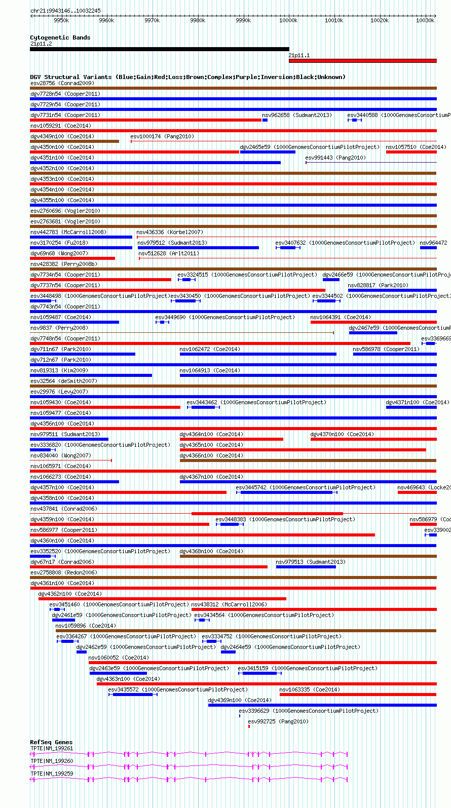 | | Variant Type | CNV loss | | Copy Number | | | Allele State | | | Allele Origin | | | Probe Count | | | Validation Flag | | | Merged Status | M | | Merged Variants | | | Supporting Variants | nsv1063986, nsv1057872, nsv1056354, nsv1061947, nsv1058791 | | Samples | | | Known Genes | TPTE | | Method | SNP array | | Analysis | Affymetrix SNP array copy number analysis | | Platform | Affymetrix SNP Array 6.0 | | Comments | | | Reference | Coe_et_al_2014 | | Pubmed ID | 25217958 | | Accession Number(s) | dgv4361n100